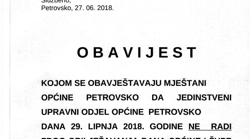 Read moreKOJOM SE OBAVJEŠTAVAJU MJEŠTANI OPĆINE PETROVSKO DA JEDINSTVENI UPRAVNI ODJEL OPĆINE PETROVSKO DANA 29. LIPNJA 2018. GODINE NE RADI ZBOG