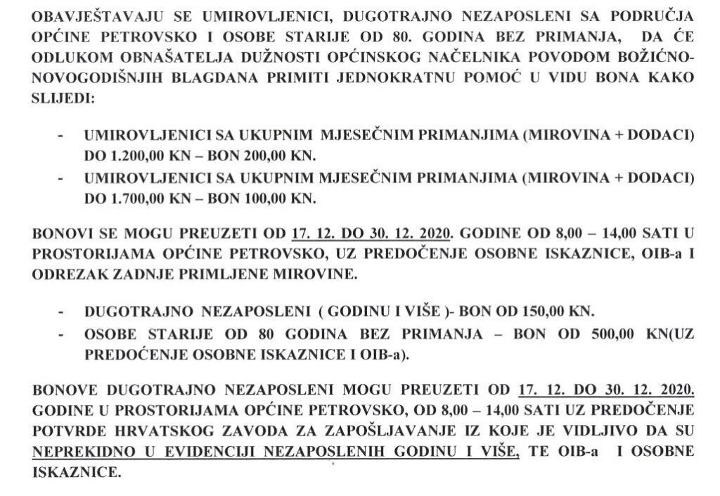 Općina Petrovsko / Vijesti / OBAVIJEST UMIROVLJENICIMA DUGOTRAJNO NEZAPOSLENIMA I OSOBAMA STARIJJM OD 80. GODINA BEZ PRIMANJA